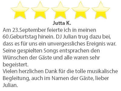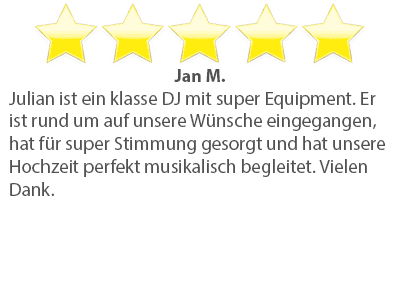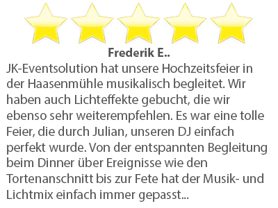 JK Eventsolution Hochzeits-DJ Party-DJ Technikpakete Wedding-Tipps Location-Guide Musikbögen Fragen vor der Buchung Fotobox & mehr Blog Impressionen Bewertungen